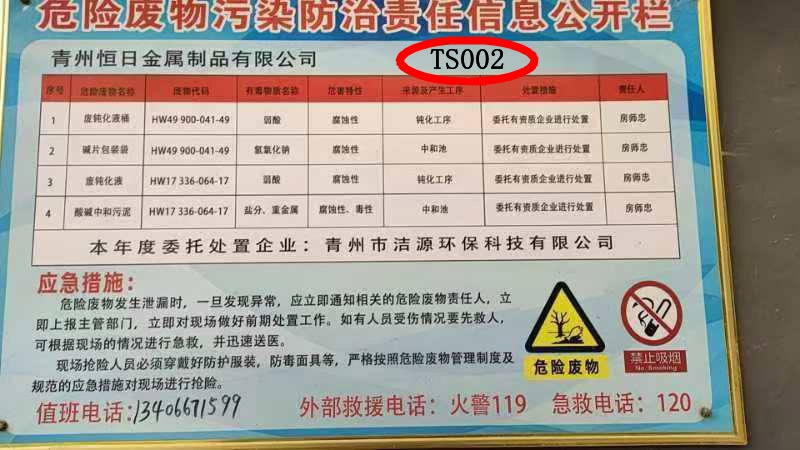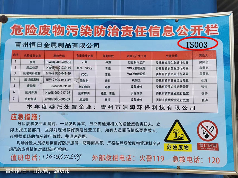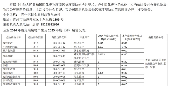 2026年青州恒日金屬制品有限公司危險廢物污染環境防治信 息公示
